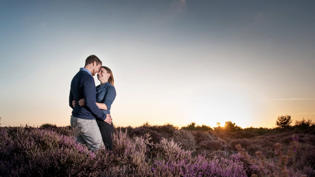 What we really loved about this shoot was that we got to capture the changing light throughout the day. The English weather is often so unpredictable but on this day, it was perfect for a stroll along Dunwich beach and the sky was a beautiful rich blue. We spent such a fun afternoon snapping on the beach that the evening crept up on us and we began to lose the sun over the horizon. It was beautiful. The sunset spread a gorgeous warm glow behind our couple so we changed it up from taking photos on the blustery beach to getting amongst the lilac heathers. We captured some gorgeous moments on this beach, we hope you enjoy.