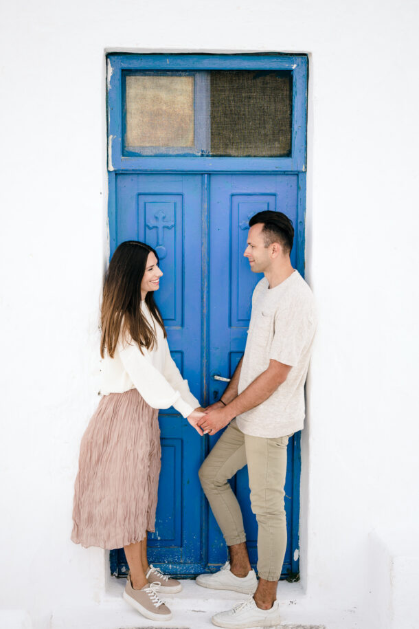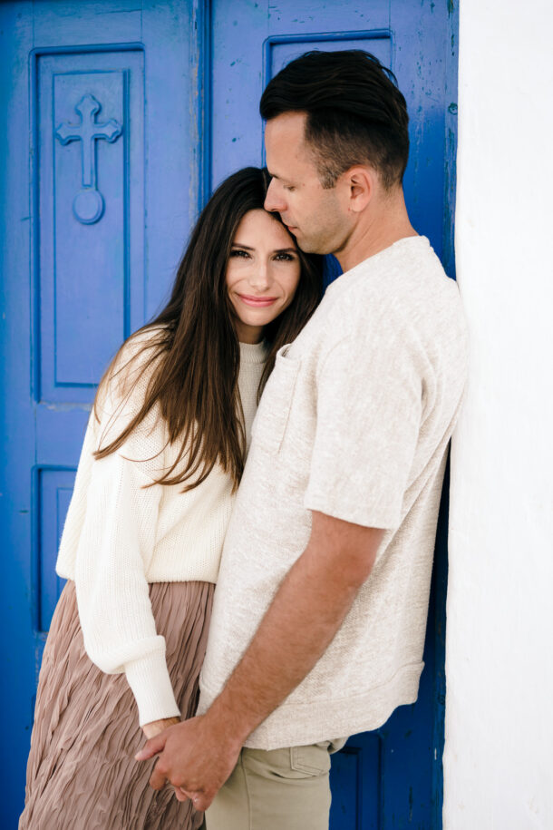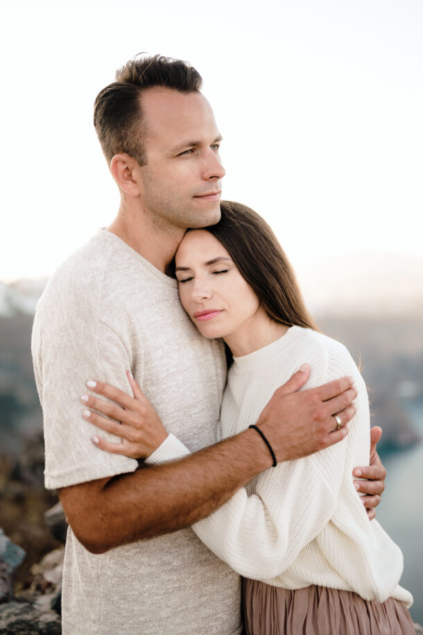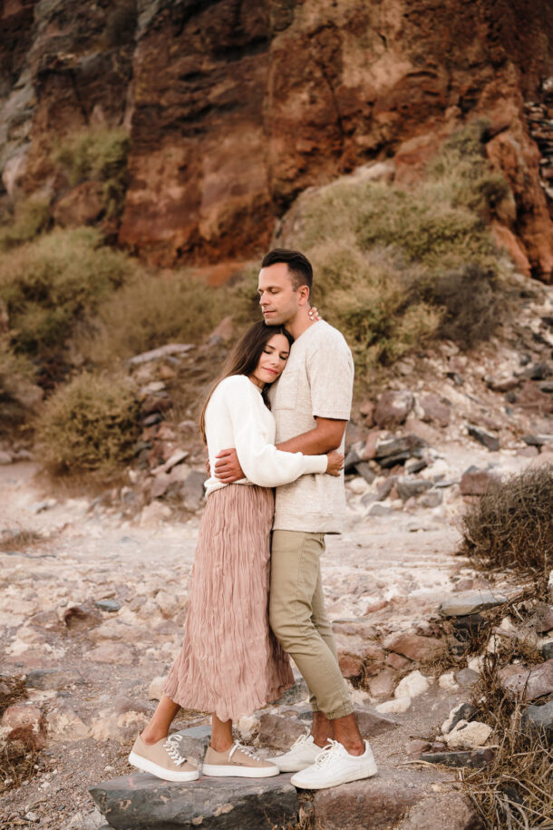 We use couple shoots to have some valuable time with our couples before their wedding day, to get to know them, to make them feel comfortable, and to adventure. This was Ola and Piotrek’s first time visiting Santorini so we took them to our favourite spot – the Skaros Rock in Imerovigli, one of the most prominent landmarks on the island. We love it so much because the views are breathtaking and it has a romantic feel about it. It’s also our favourite place to watch sunsets in Santorini.