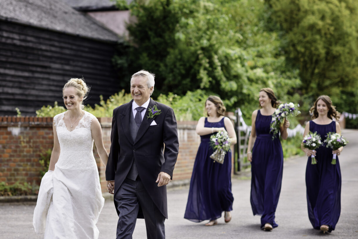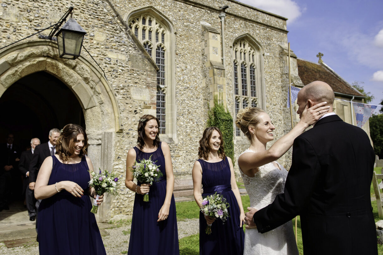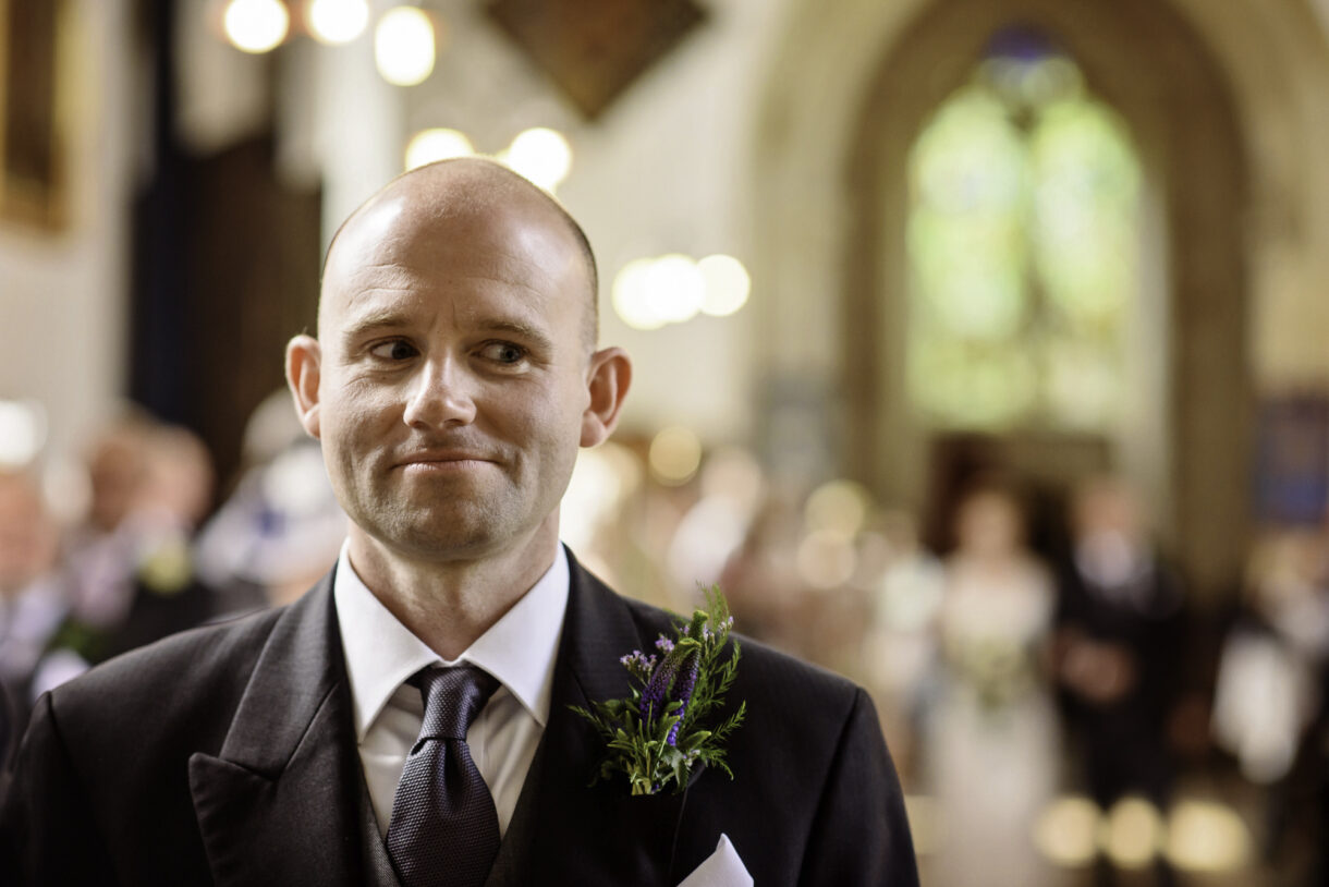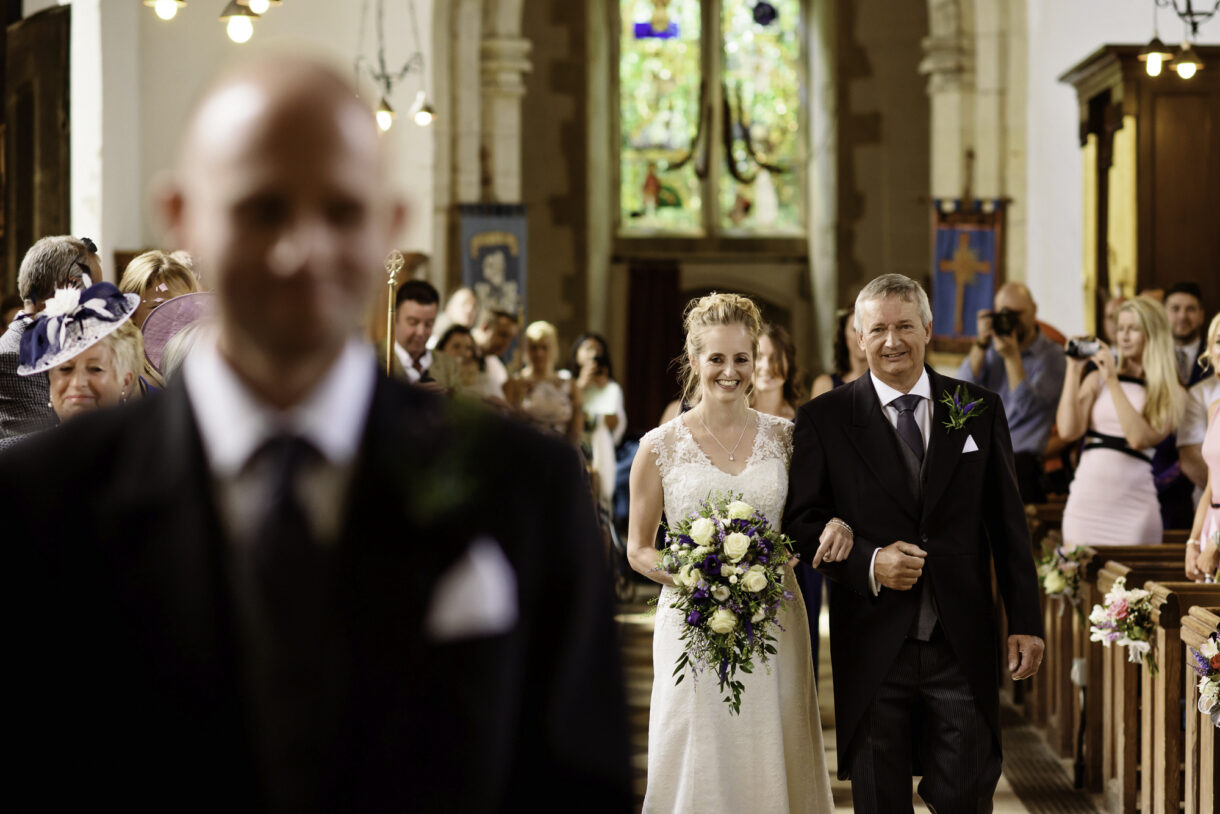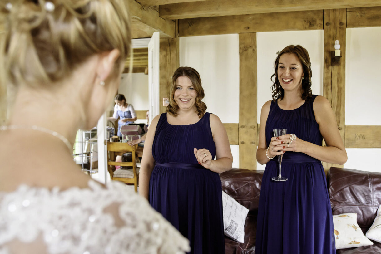 Emma and her bridesmaids started the day at home, drinking champagne and swapping gifts whilst Al enjoyed a pint and some food at a local pub with friends and family. There was such a jovial atmosphere, both of them joking and laughing as they prepared for the big day, it was really rather infectious. Emma looked stunning in an exquisite lace dress with button detailing down the back and delicate sequin sparkles. Her three bridesmaids wore long rich Navy-blue gowns, perfectly complemented by the blue, violet and white bouquets.