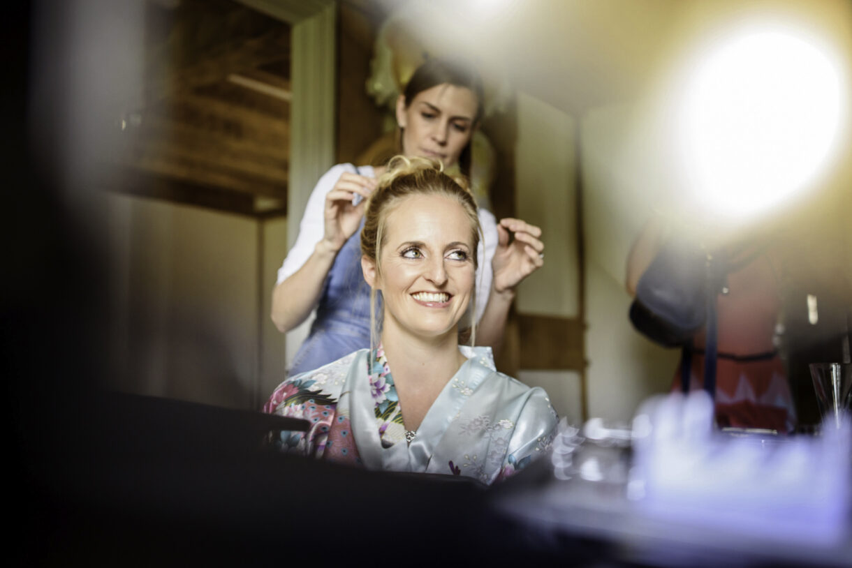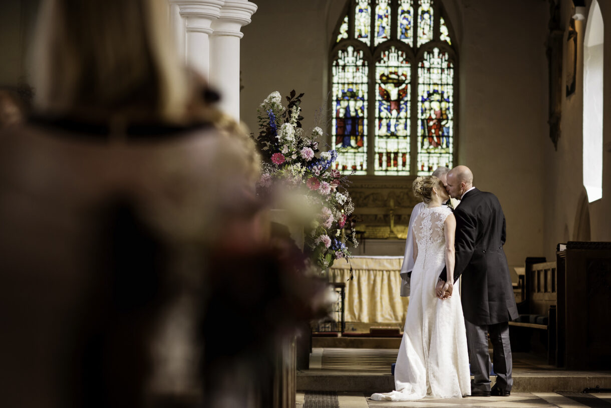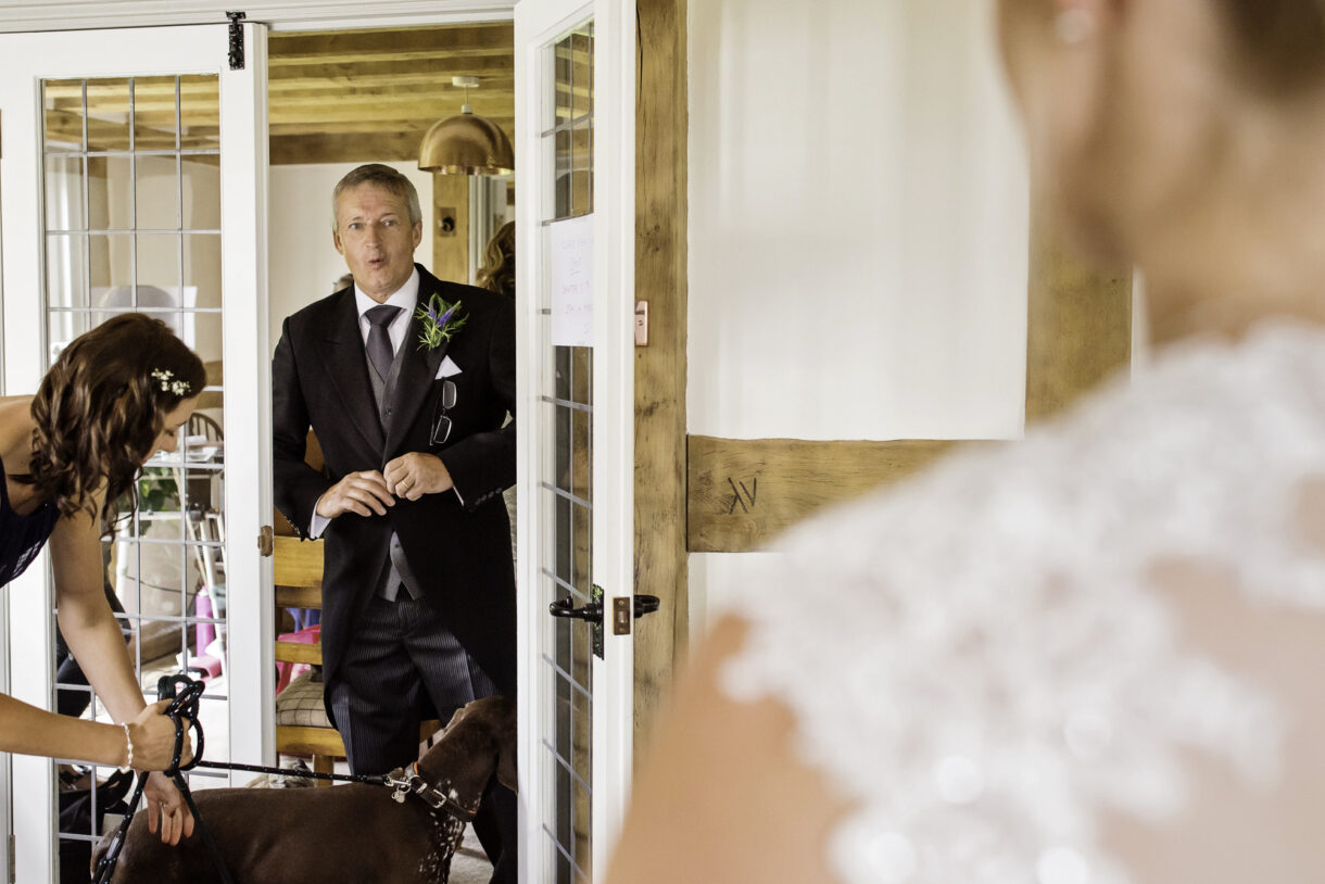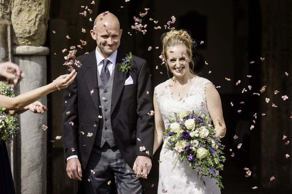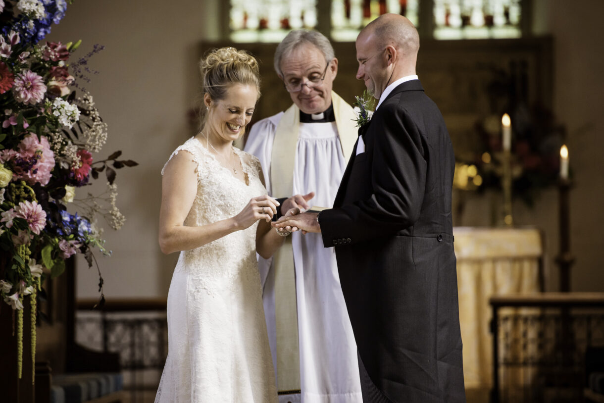 Emma and her bridesmaids started the day at home, drinking champagne and swapping gifts whilst Al enjoyed a pint and some food at a local pub with friends and family. There was such a jovial atmosphere, both of them joking and laughing as they prepared for the big day, it was really rather infectious. Emma looked stunning in an exquisite lace dress with button detailing down the back and delicate sequin sparkles. Her three bridesmaids wore long rich Navy-blue gowns, perfectly complemented by the blue, violet and white bouquets.