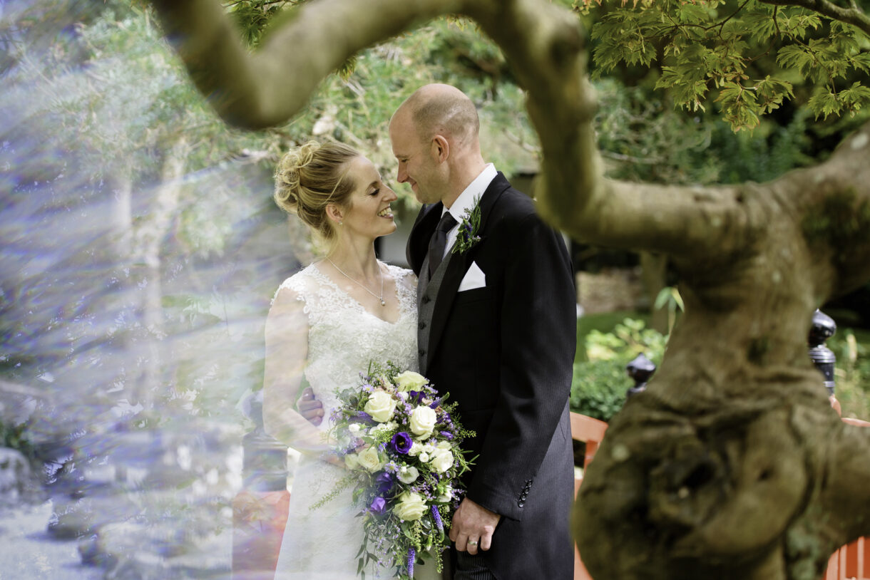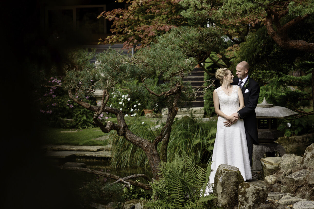 The traditional ceremony was held in a local church, just a couple of minutes from their house, after which, the newlyweds joined us for a stroll around some beautiful Japanese gardens. We didn’t expect to come across this little green oasis with vibrant red gates, crimson bridges and stone steps up to Japanese pagodas, but it was a fantastic opportunity for us to capture some gorgeous natural bride and groom portraits among the twisted and knotted trees. Emma and Al were a joy to photograph, posing easily and smiling at each other. We love stealing our couples away for little photo shoots like this as we think they really relax out of the way of the guests and the resulting photographs are always so charming!